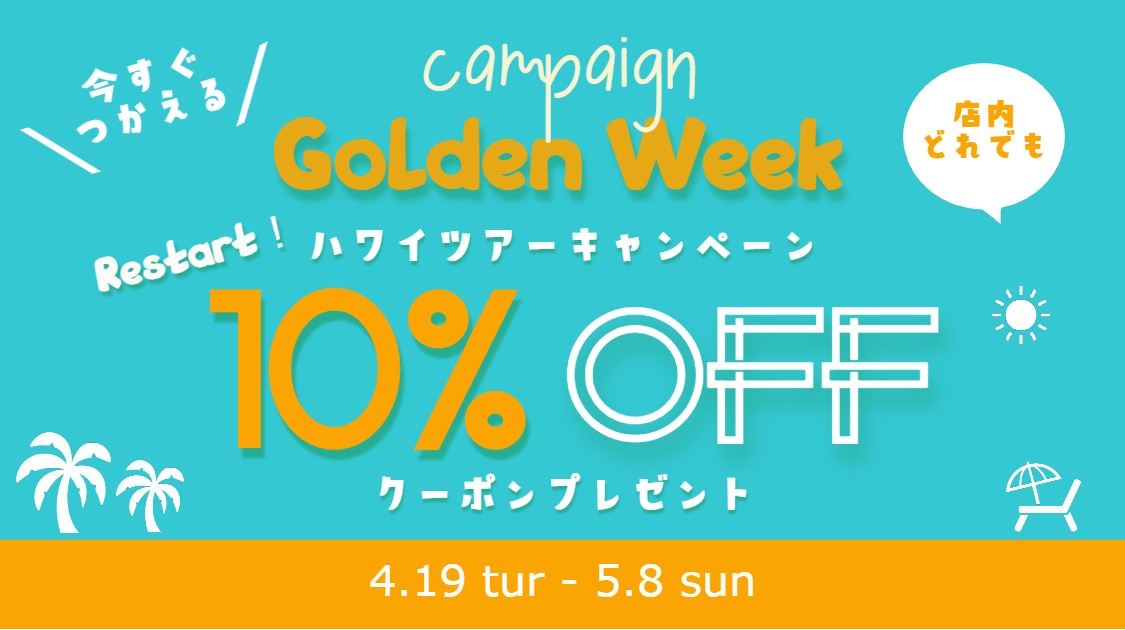 ハワイアンホースト公式ショッピングサイトで、店内全品10%割引になるクーポンをプレゼントする「ハワイツアー再開!10%OFFクーポンプレゼントキャンペーン」を2022年4月19日(火)~5月8日(日)まで実施しています。