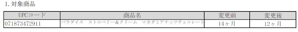 この度、弊社取扱い商品の『パラダイスコレクション ストロベリー&クリーム マカダミアナッツチョコレート』について、賞味期間を変更することとなりましたので、以下のとおりご案内いたします。