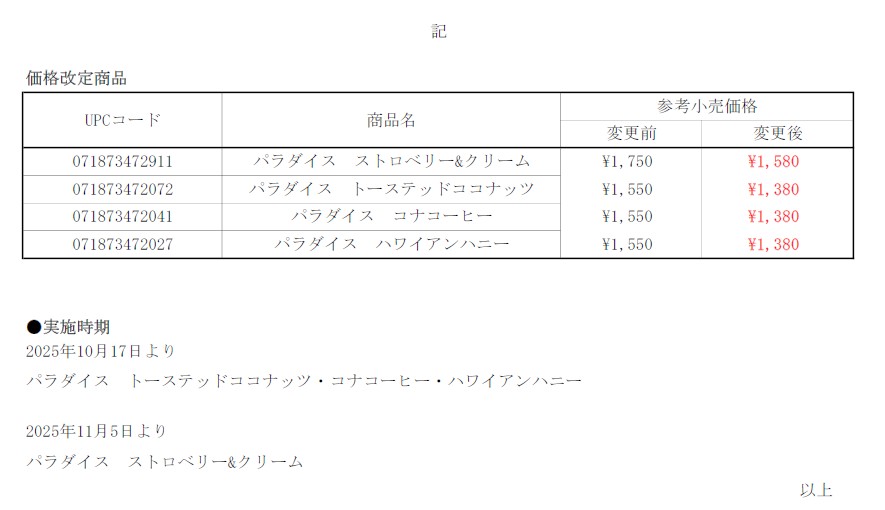 さて、この度ハワイアンホースト・ジャパン(株)では、一部商品の価格を改定させていただくこととなりましたのでお知らせいたします。